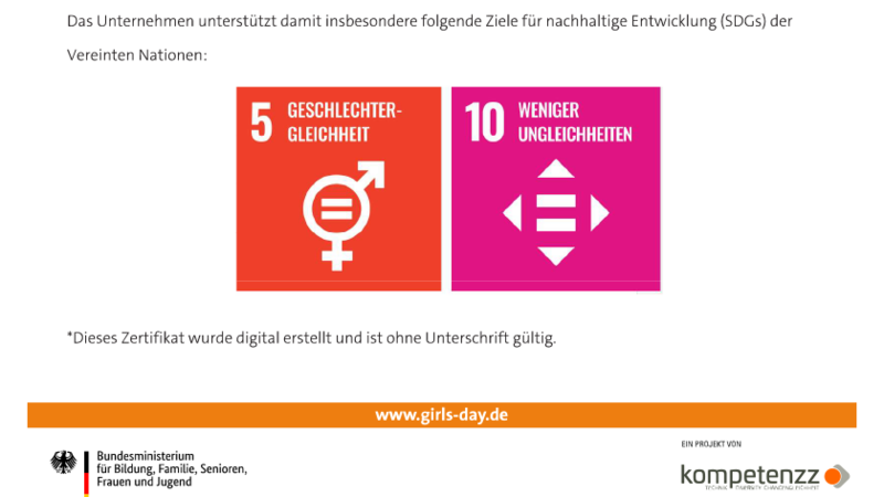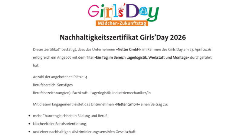 Für dieses Engagement wurde die Netter GmbH mit einem Nachhaltigkeitszertifikat ausgezeichnet. Dieses bestätigt den Beitrag des Unternehmens zu mehr Chancengleichheit in Bildung und Beruf, einer klischeefreien Berufsorientierung sowie einer diskriminierungssensiblen und nachhaltigen Gesellschaft.